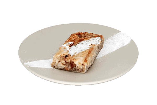 Es wird aus Blätterteig und Äpfeln hergestellt. Manchmal fügen wir auch Rosinen und Rum hinzu.