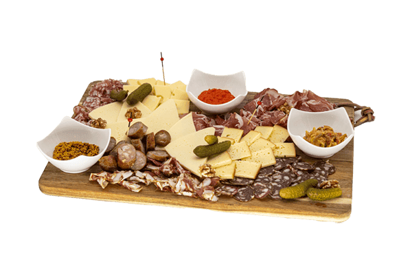 Der kalte Aufschnitt ist für zwei Personen zubereitet: Vier verschiedene, sorgfältig ausgewählte Salamisorten und vier verschiedene Käsesorten.
